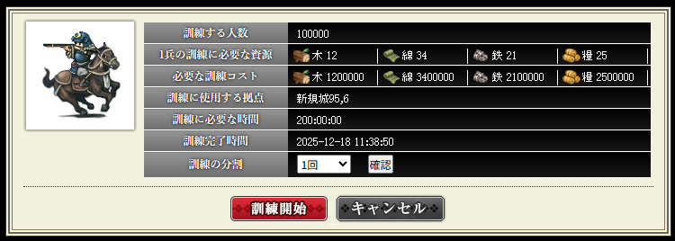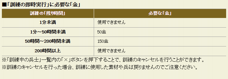 多めに兵数を練兵して、即時実行以上に時間がかかってしまうと新たに兵士練兵することができなくなるので、
