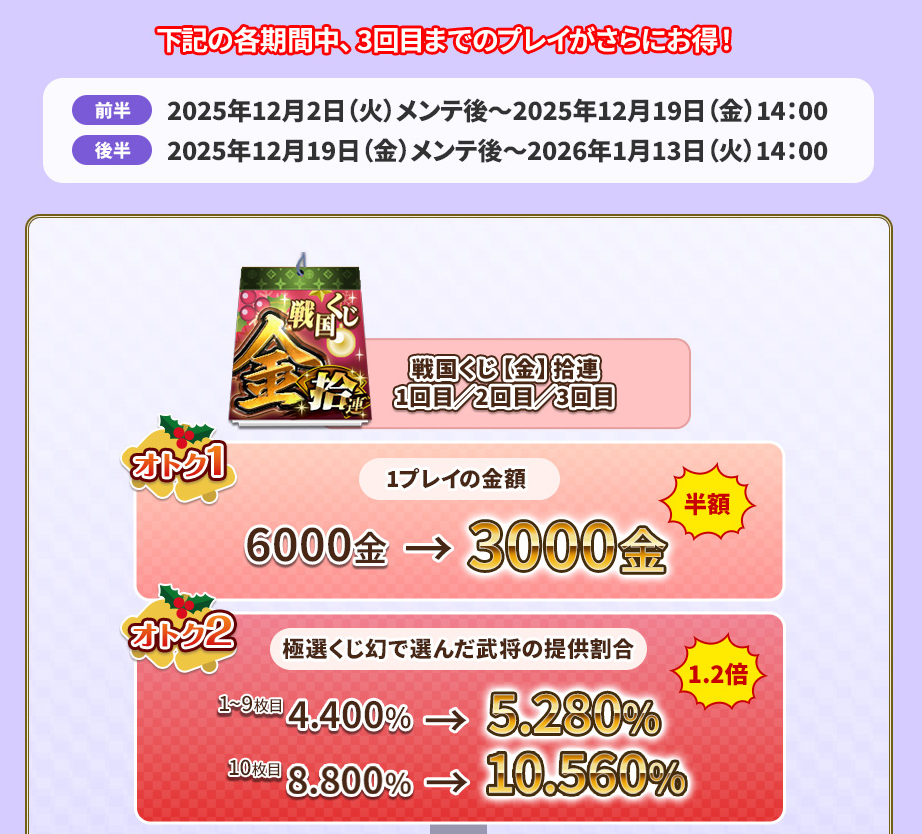 気が付いたら2回目の3000円×3回金くじ10連半額セールをしていたので、メリークリスマスではないですがお金をつっこんできました。