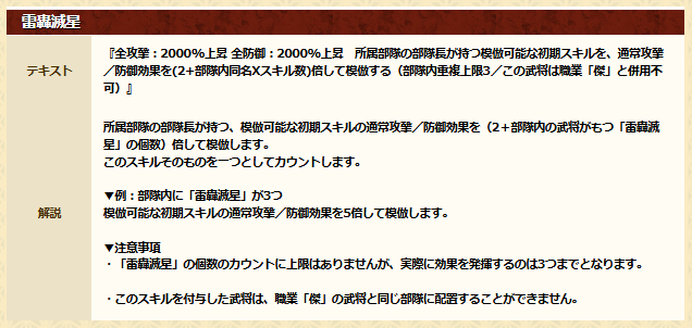 所属部隊の部隊長が持つ模倣可能な初期スキルを、通常攻撃/防御効果を(2+部隊内【雷轟滅星】数)倍して模倣する