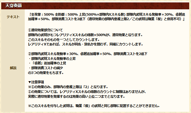 全攻撃:〇% 全防御:〇% 上昇 (500%×部隊内Xスキル数)