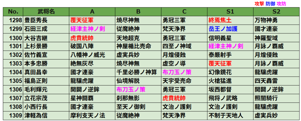 | 1299 | 石田三成 | 経津主神ノ剣 | 従魔絶神 | 梵天浄界 | 岳王ノ加護 | 國才連豪 |